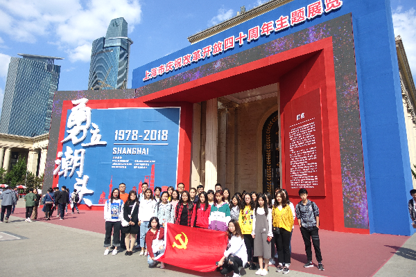 2018年10月13日下午,保险学院教工第一、教工第二党支部、学生党支部以及入党积极分子一同前往参观位于上海展览中心的“勇立潮头——上海市庆祝改革开放四十周年”大型主题展览。