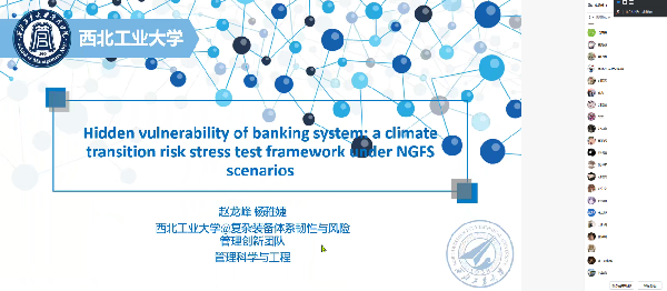 11月20日,保险学院第三期“保险精算+”学术沙龙顺利召开。本期沙龙特邀西北工业大学杨雅婕博士作题为:Hidden vulnerability of banking system: a climate transition risk stress test framework under NGFS scenarios的报告。活动通过线上进行,由学院副院长杨青骥主持,学院全体专业教师及部分学生代表出席。