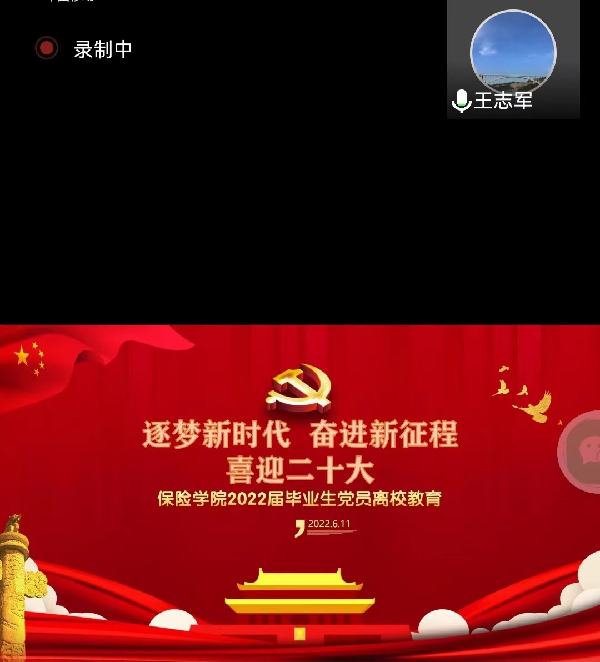 为进一步强化毕业生党员意识和党员身份教育,强化毕业生党员组织纪律观念,保险学院党总支根据党委组织部统一部署和要求,于6月10日上午采用线上方式开展以“逐梦新时代,奋进新征程,喜迎党的二十大”为主题的毕业生党员离校教育活动,引导全体毕业生党员不忘入党初心,牢记党员使命,在新的学习或工作岗位中持续发挥共产党员的先锋模范作用,以昂扬姿态迎接党的二十大胜利召开。保险学院党总支副书记、副院长王志军,专职组织员孟庆莉,各学生党支部书记及全体毕业生党员参加了此次活动。离校教育活动由学生二支部书记周文彬主持。