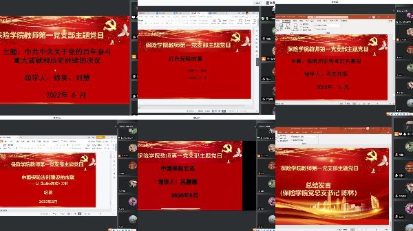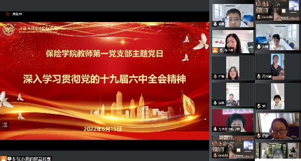 为进一步学深悟透党的十九届六中全会精神,学懂弄通党百年奋斗的光辉历程,学懂弄通党坚守初心使命的执着奋斗,学懂弄通党百年奋斗的历史意义和历史经验,根据主题党日的要求和面向全校的主题党日的安排,在党总支的统一部署和指导下,在支部党员的共同努力下,支部科学筹划,认真准备,结合保险学一流专业建设和教学科研工作,认真学习《决议》精神,并就如何提升思想意识,以实际行动促进学院中心工作开展学习和研讨。6月15日下午,保险学院教师第一党支部线上“深入学习贯彻党的十九届六中全会精神”校级观摩主题党日活动顺利开展。学院党总支书记、教师第一党支部包干负责领导陈林、学院组织员孟庆莉和支部全体党员出席,会议由支部书记万晴瑶主持。