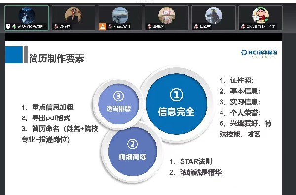 为保障2023届毕业生就业工作顺利进行,引导同学们为毕业求职做足准备,充分认识简历制作和面试的重要性,11月9日,保险学院“IN职场”职业素养工作室于举行“简历制作和面试技巧”线上专题讲座。本次讲座邀请新华人寿上海分公司人力资源部资深校招HR留浩担任主讲嘉宾,学院2019级、2020级近70名学生参加了此次讲座。