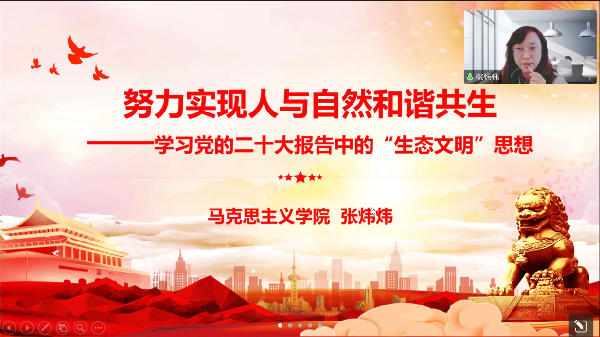 为深入学习宣传贯彻党的二十大精神,准确把握报告的精神实质和丰富内涵,11月23日下午,保险学院青马分会邀请分会指导老师,马克思主义学院教师张炜炜作“努力实现人与自然和谐共生”的专题学习讲座。讲座由学生第一党支部书记胡亭主持,学院组织员孟庆莉、第二学生党支部书记周文彬,学生第一、第二党支部和院青马分会全体会员共65人参加了讲座。