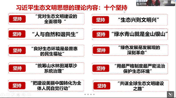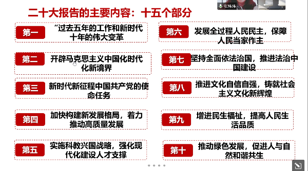张老师首先分十五个部分给大家介绍了二十大报告的主要内容,指出中国式现代化的五个特色为:“人口规模巨大的现代化”、“全体人民共同富裕的现代化”、“物质文明和精神文明相协调的现代化”、“人与自然和谐共生的现代化”和“走和平发展道路的现代化”。