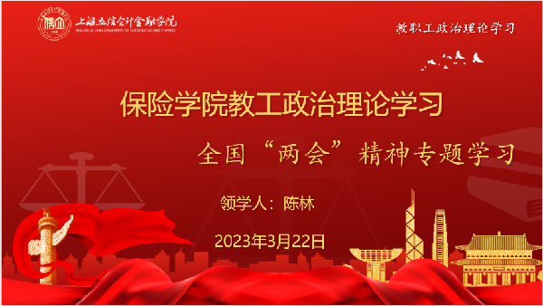 为深入学习贯彻2023年全国两会精神,3月22日下午,保险学院在2215会议室开展了全国两会精神教职工政治理论学习。会议由党总支书记陈林主持,全体教工参加学习。