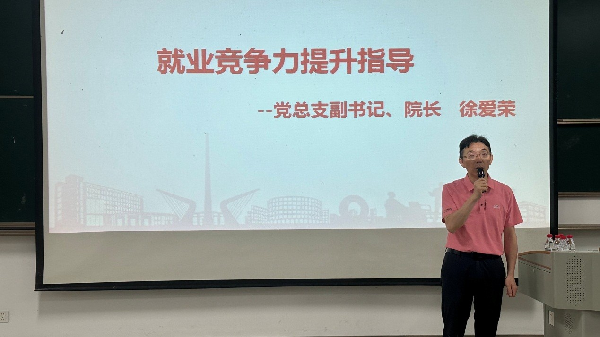 院长徐爱荣就提升学生就业竞争力做专题指导报告。他根据学院近三年来各项就业数据情况,结合学院专业特色、人才培养模式、行业发展前景等因素,鼓励同学们要不断提升自己的专业技能、敬业精神、情商思维等综合素质,树立走向社会的担当奉献精神。
