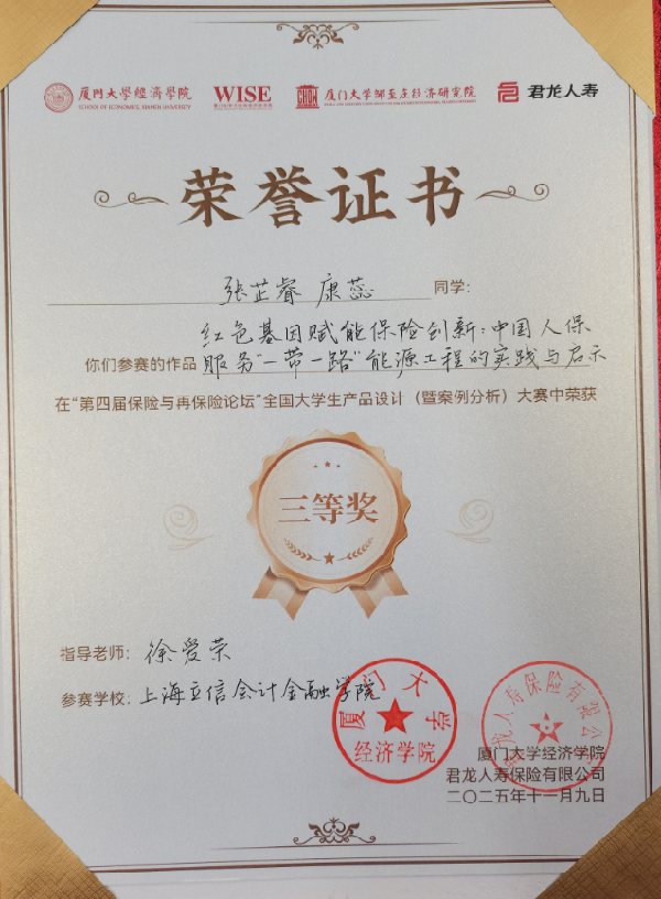 2023级精算学专业学生张芷睿、康蕊的作品《红色基因赋能保险创新,中国人保服务“一带一路”能源工程的实践与启示》,在全国大学生保险产品(暨案例)大赛中成功斩获本科生组三等奖。
