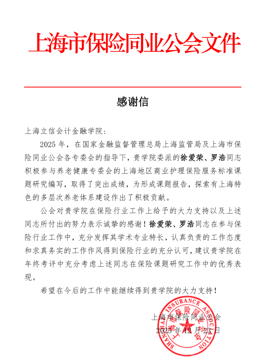 近日,上海市保险同业公会来函,对学院在课题研究中的支持表示感谢,并希望今后继续深化合作,共同推进保险行业相关研究工作。