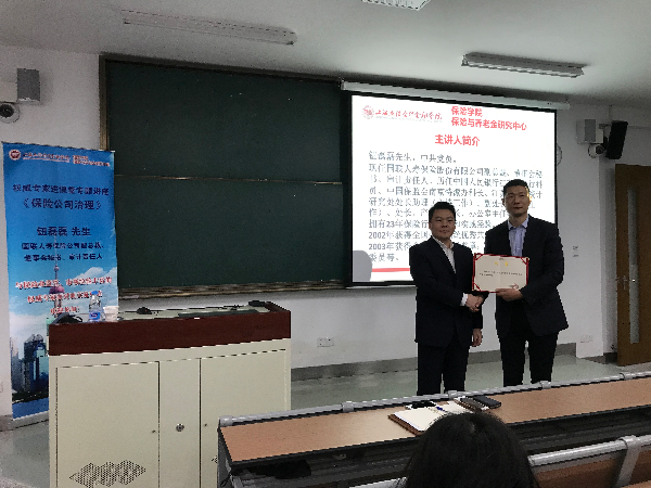 钮总拥有23年丰富的保险行业监管和实践经验,历任中国人民银行江苏省分行科员、中国保监会南京特派办科长、江苏保监局统计研究处处长、产险处处长、办公室主任等职;曾获得全国金融系统优秀共青团员称号,并获得全国五一劳动奖章,兼任全国金融青联委员等,是业界楷模。聘任仪式结束后,钮总应保险学院和保险与养老金研究中心的邀请,主讲了新一期权威专家进课堂专题讲座。该讲座由保险与养老金研究中心主任万晴瑶老师主持,杨院长总结,100多位来自保险学院2015级和2016级同学参加。