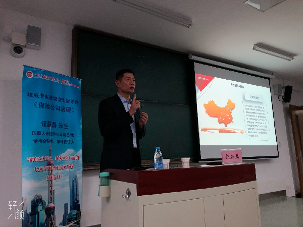 钮总以《保险公司的公司治理与监管规则》主题,从公司治理的概念出发,着重分析公司治理为什么是现代保险监管体系的三大支柱之一,监管对公司治理的要求,并详细分析了公司治理风险的案例,最后向大家介绍了国联人寿公司及公司发展愿景。钮总的讲座既高屋建瓴又生动详实,他以诙谐幽默的语言,通过一个个具体的案例深入剖析,与师生探讨了保险行业、监管、市场和个人发展的相关问题,如以公司董事会的制度和运作为例说明公司治理的重要性;钮总还与大家坦诚分享了许多成功的秘诀,对保险专业本科学生如何拓展知识面,提高思考能力及规划人生提出了许多建设性的指导意见和建议。互动阶段,钮总睿智而耐心地回答了同学们普遍感兴趣和关心的问题,如行业发展、市场环境、个人规划、发展方向选择等,并欢迎大家到国联人寿调研、实习或工作。